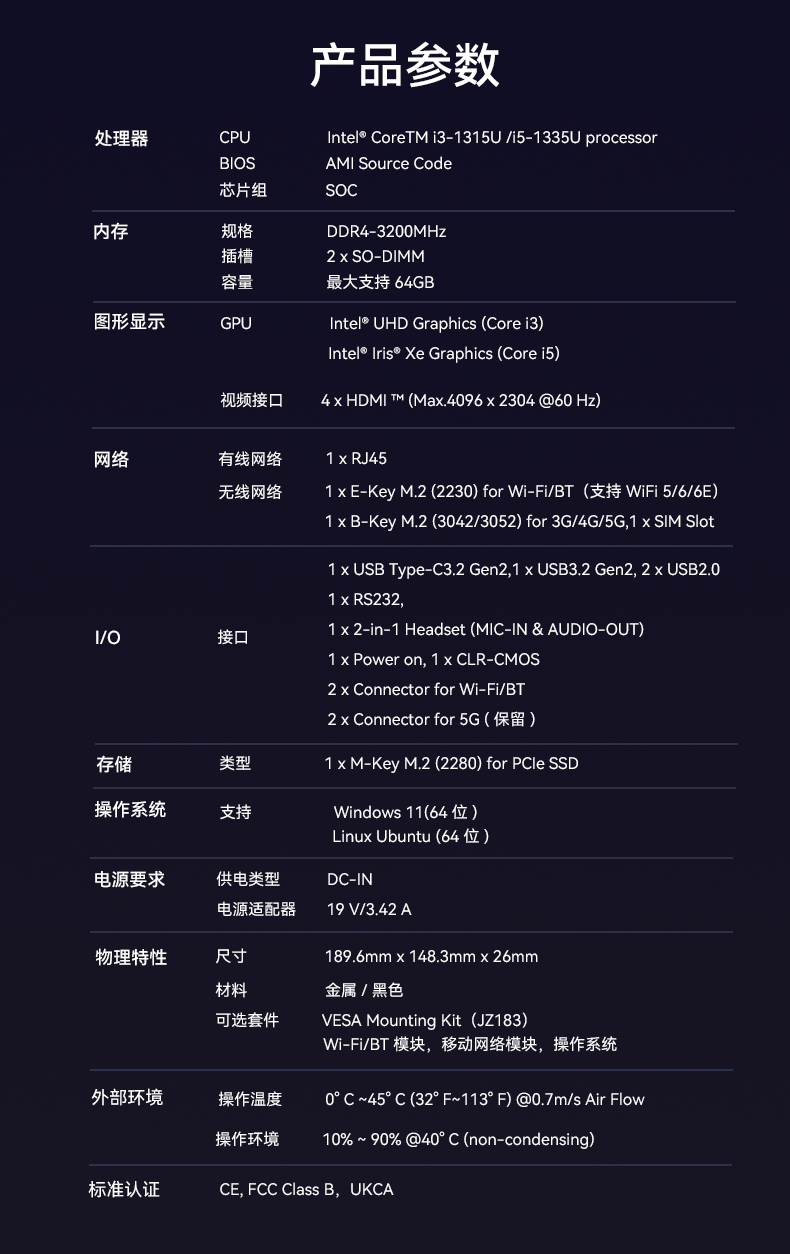 太阳成集团·tyc4633科技D613采用英特尔Raptor Lake酷睿i3-1315U/i5-1335U 处理器,作为一款性能强悍的主机,它的TDP仅15W,能有效降低能耗,延长电池寿命。在内存方面,D613采用2 x SO-DIMM DDR4-3200 MHz,最大可达64GB,并配备1 x M-Key M.2 (2280) for PCIe SSD。