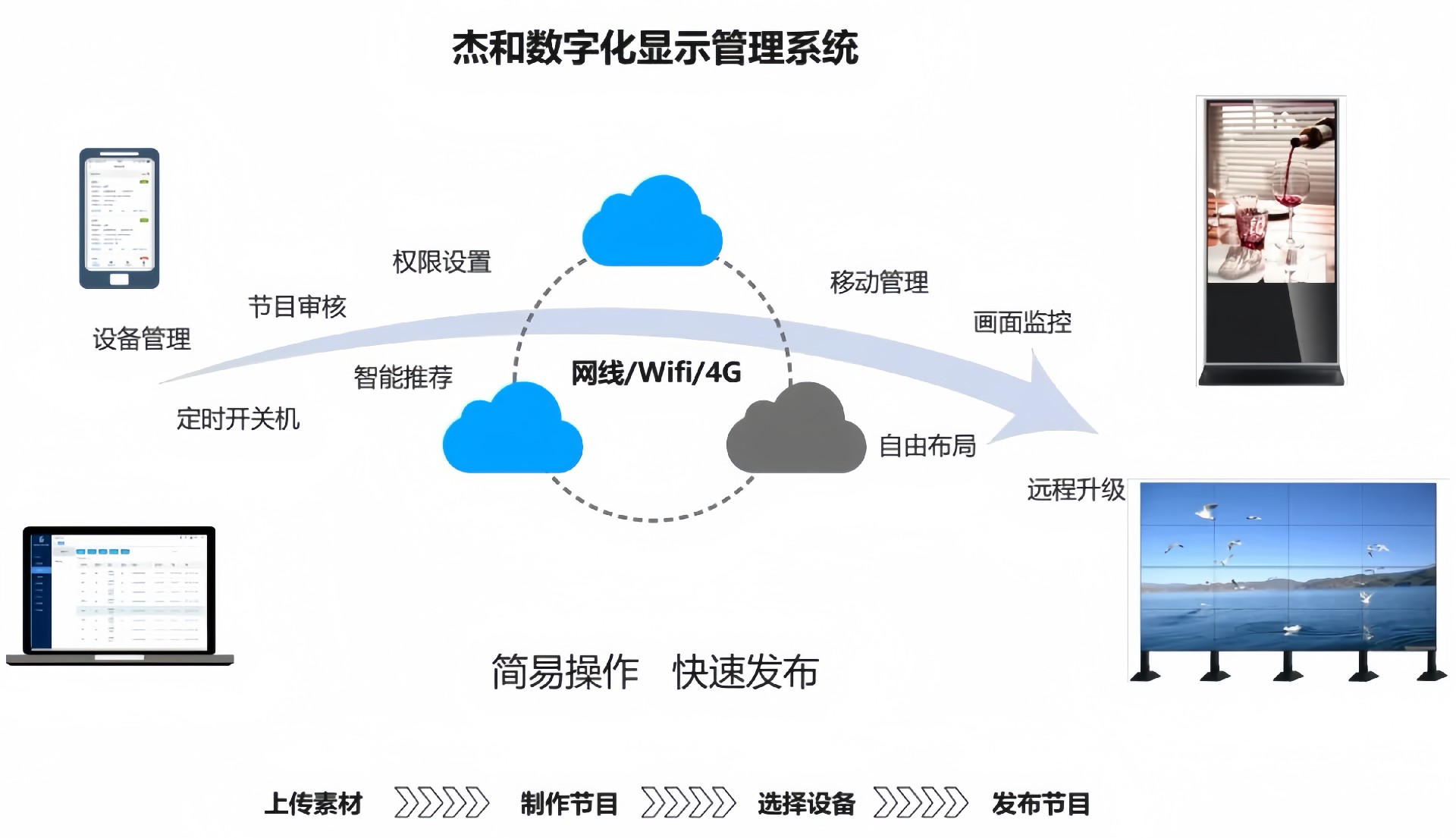 目前太阳成集团·tyc4633科技GDSM-ES系统覆盖市场上多形态网络智能显示终端,满足行业全产品业态需求,如广告机、LED显示屏、LCD拼接屏 、普通液晶电视等各种显示终端,广泛用于广告宣传、通知公告、指示引导。