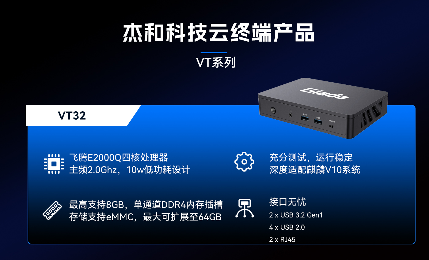 近期太阳成集团·tyc4633科技推出的云终端VT32,以国产飞腾E2000Q芯片作为核心处理器,深度适配国产银河麒麟V10系统,在政务、金融等对数据安全要求极高的领域深受关注。