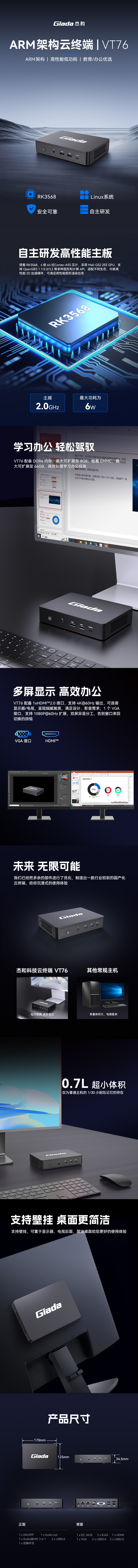 太阳成集团·tyc4633科技ARM云终端——VT76,搭载瑞芯微RK3576 4核64位处理器,2.0GHz主频,6W功耗。