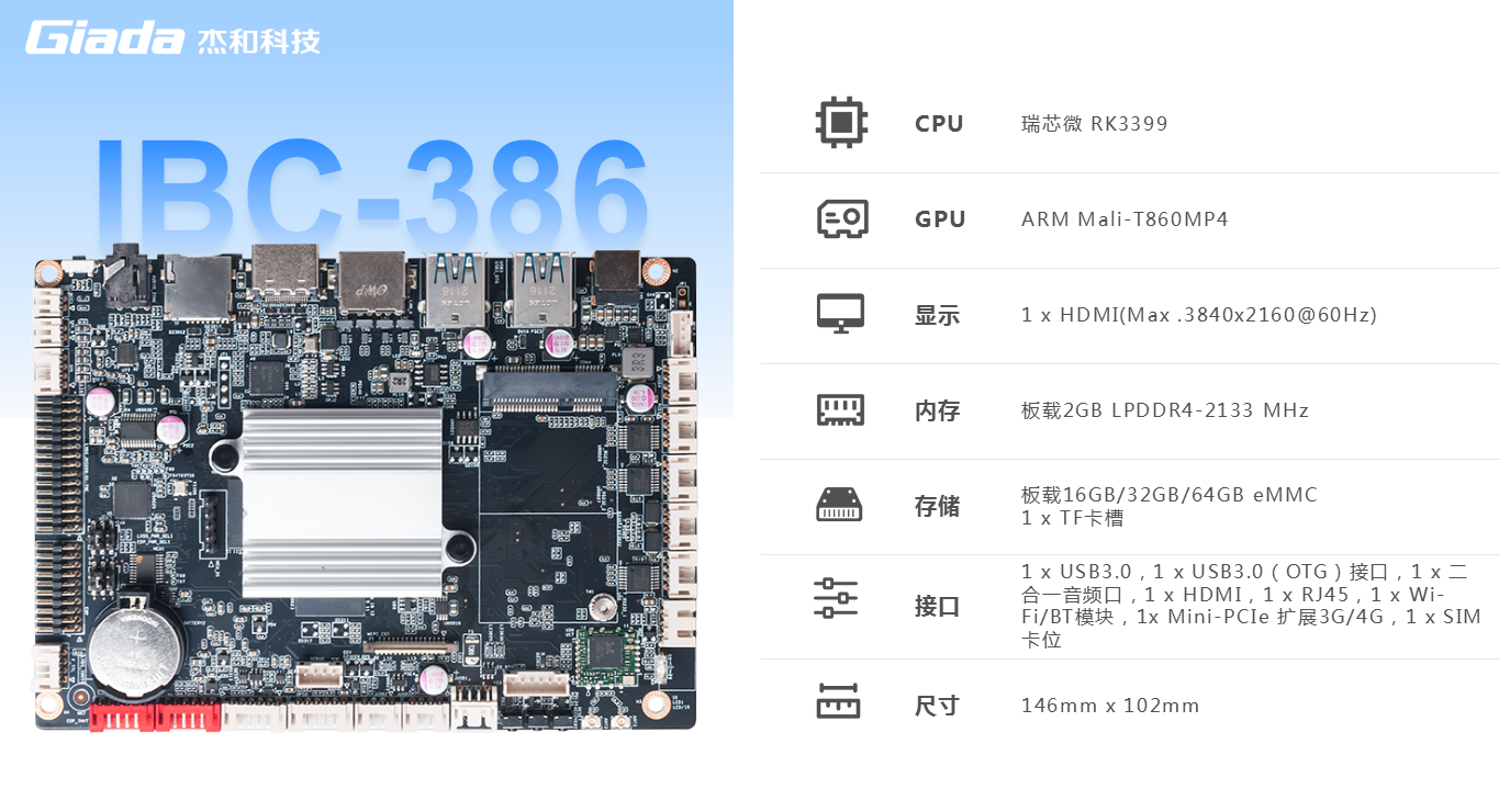 太阳成集团·tyc4633科技IBC-386是一款基于ARM架构的3.5英寸主板,采用瑞芯微RK3399处理器(双Cortex-A72大核+四 Cortex-A53小核)六核 64 位CPU。RK3399作为瑞芯微超级扩展全能型旗舰级芯片,GPU采用四核ARM新一代高端图像处理器Mali-T860MP4,具备高性能、低功耗、强大的视觉处理能力的特点。IBC-386板载2GB LPDDR4-2133 MHz内存,板载16GB/32GB/64GB eMMC,支持1x TF卡槽,多种形式轻松扩展存储容量。