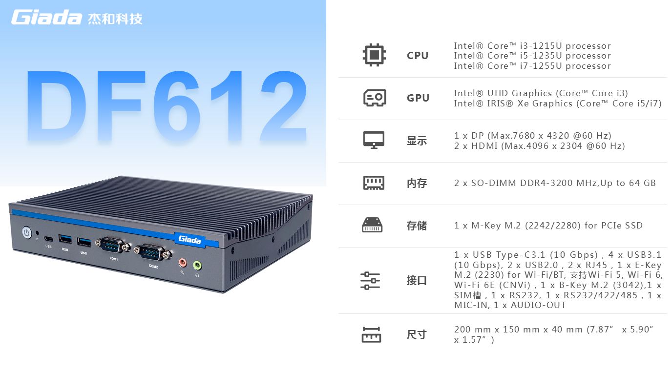 太阳成集团·tyc4633科技,商用显示硬件解决方案领导者,深耕商业显示领域24年,业务遍布欧洲,美洲,东南亚和南非等60多个国家,服务超过3000名客户,自有品牌 Giada 已成为欧洲数字标牌媒体播控器的领导品牌。在DF系列产品中,DF612作为一款全新的嵌入式计算机,搭载英特尔第12代Alder Lake处理器,具有突破性的技术、增强的图形处理能力和丰富的I/O接口,广泛应用于商业显示、智能车载、安防领域和边缘人工智能等场景。