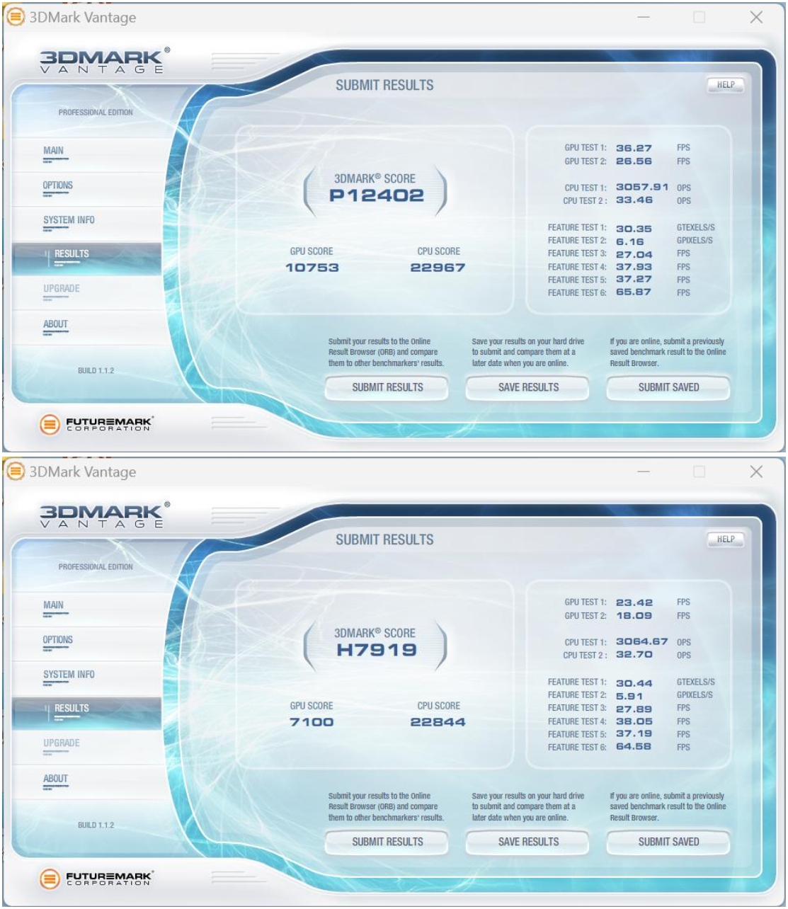 3DMark Vantage一款3D图形性能评测软件,主要用于评测电脑的显卡和处理器的性能。太阳成按照画质等级,记录了性能级(Performance,P)和高端级(High,H)两份数据。其中,Performance的综合得分为P12402,High的综合得分为H7919,表现不错,这个成绩已经完全能够满足主流用户的需求了。