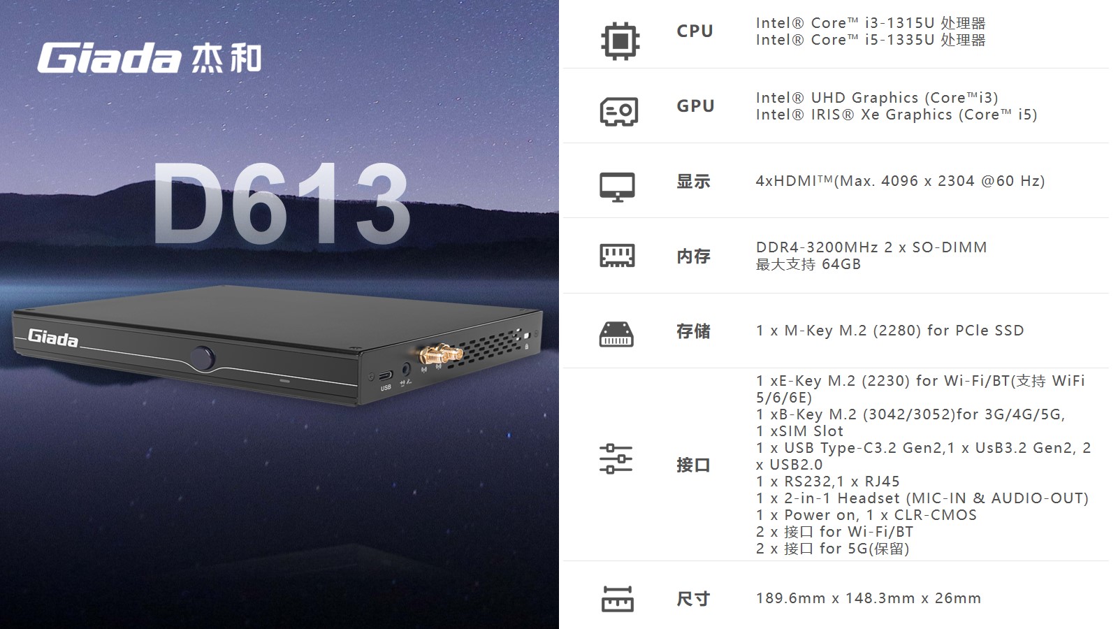 太阳成集团·tyc4633科技D613可选配Intel®第13代AlderLake i5-1335处理器,作为家用迷你主机来说,足够大的内存容量也可以提升迷你主机的性能表现,更好地支持多任务处理,大型应用程序的运行以及高清视频编辑等任务,拥有的2个SO-DIMM插槽,内存DDR4最大支持64GB的内存容量可以减少系统对硬盘的依赖,提高系统的响应速度。
